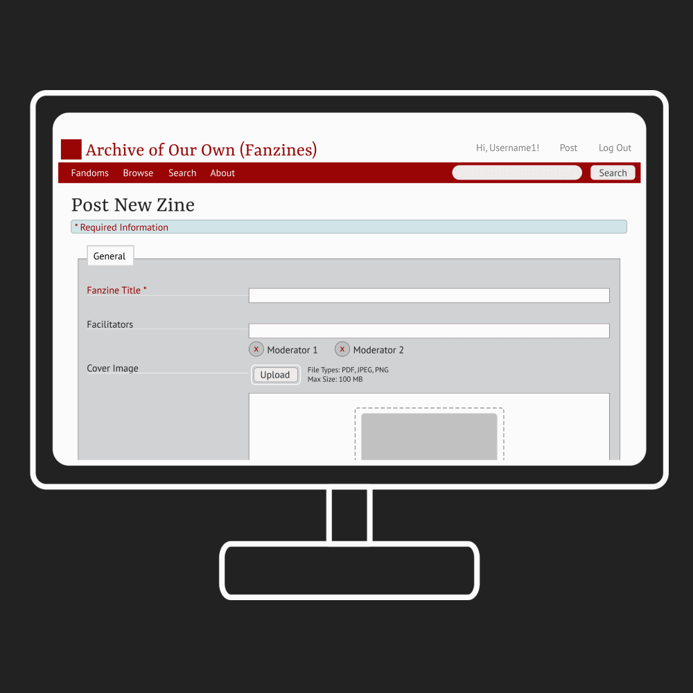 In the end, the team ended up borrowing heavily from Archive of Our Own (AO3). The logic was that rather than reinventing the wheel, a fanzine archive would function best utilizing the archival infrastructure set up by the Organization for Transformative Works. Therefore, the prototyped infrastructure borrows heavily from AO3.
